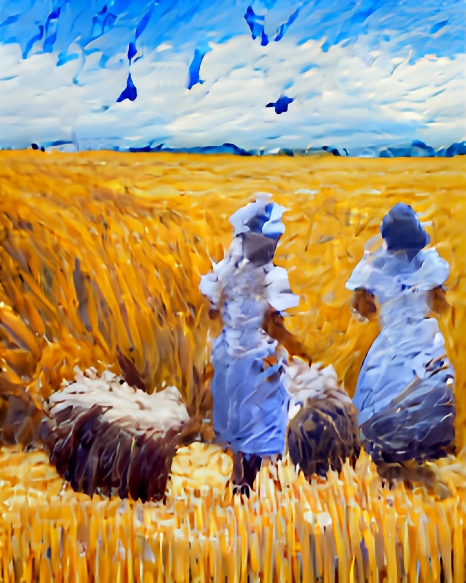 This lovely scene depicts the women of France in the Provence Region helping with reaping the wheat fields in the 1880s, as Vincent van Gogh might have painted it, with its brilliant skies as birds gather to glean whatever might have been missed. This digital painting is beloved by all who have viewed it.